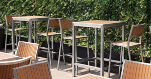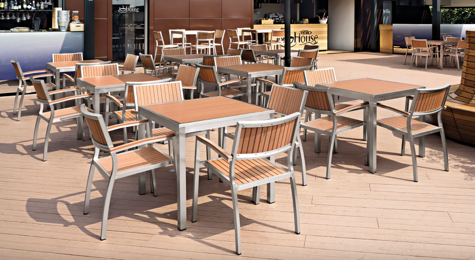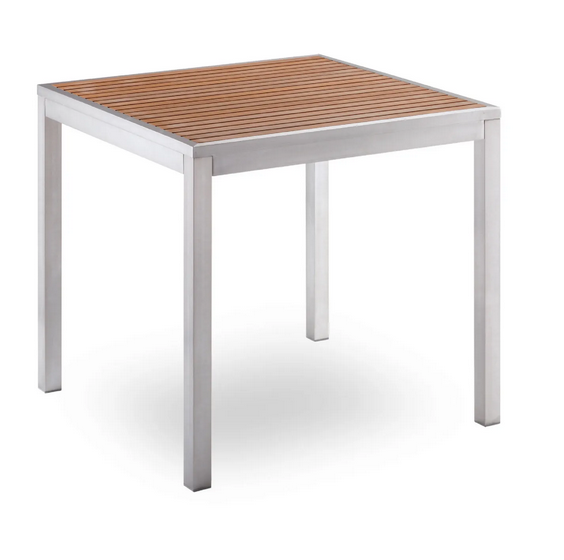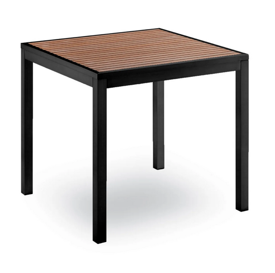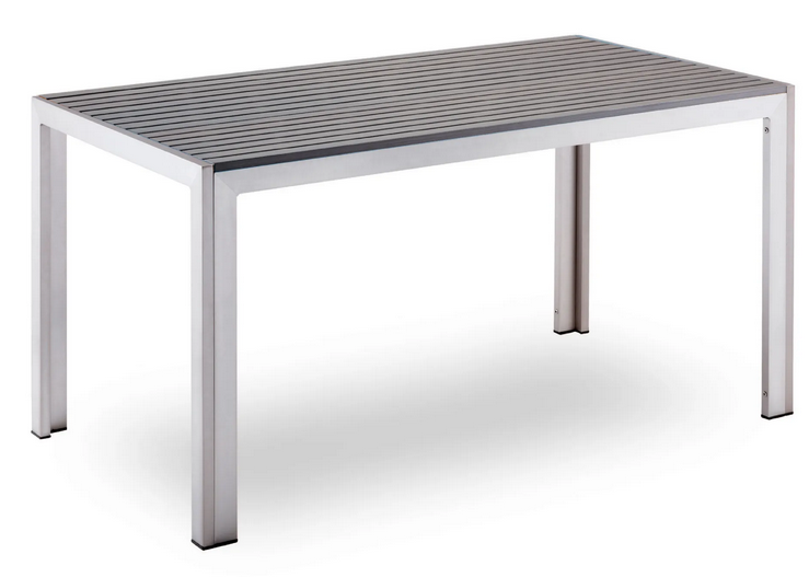 Die Tischplatte besteht aus Aluminiumlamellen mit einer Beschichtung aus thermoplastischem Material, das Holz optisch ähnelt, kratzfest und UV-beständig ist.