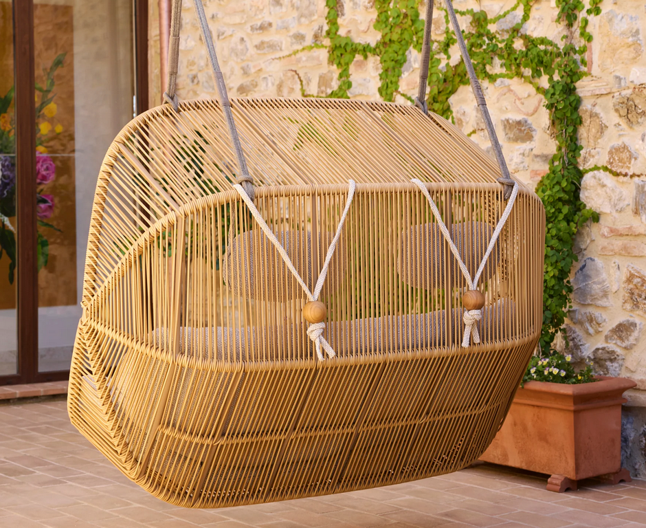 Das Hive-Sofa ist handgeflochten aus wetterbeständigem Cane-line Weave® und verfügt über ein filigranes und künstlerisches Flechtmuster, das Stil und Langlebigkeit perfekt für Ihren Außenbereich vereint. Das Sofa kann entweder an Seilen aufgehängt werden, um eine verspielte, schwebende Wirkung zu erzielen, oder auf einem soliden Untergestell aus Teakholz platziert werden, was flexible Platzierungsmöglichkeiten bietet.