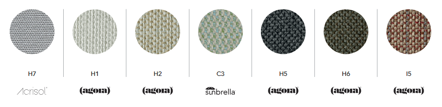 optional Kissen: Polsterung: Polyesterflocken überzogen mit 100% wasserabweisendem SprayTest-Polyestergewebe zusammen mit Polyesterfaser (Dichte 200 g/m²). Bezug: 100 % Sunbrella® -Acrylgewebe, spinndüsengefärbt, wasserabweisend und schmutzabweisend. (98% Sunbrella® -Acryl, 2% andere, nur C0-Gewebe). Bezug: Agora® -Gewebe, 78 % spinndüsengefärbtes Acryl + 22 % recyceltes spinndüsengefärbtes Acryl, wasser- und schmutzabweisend