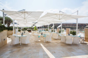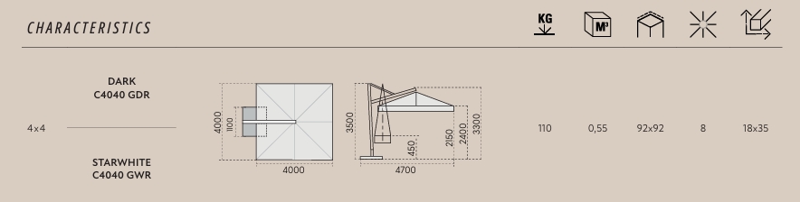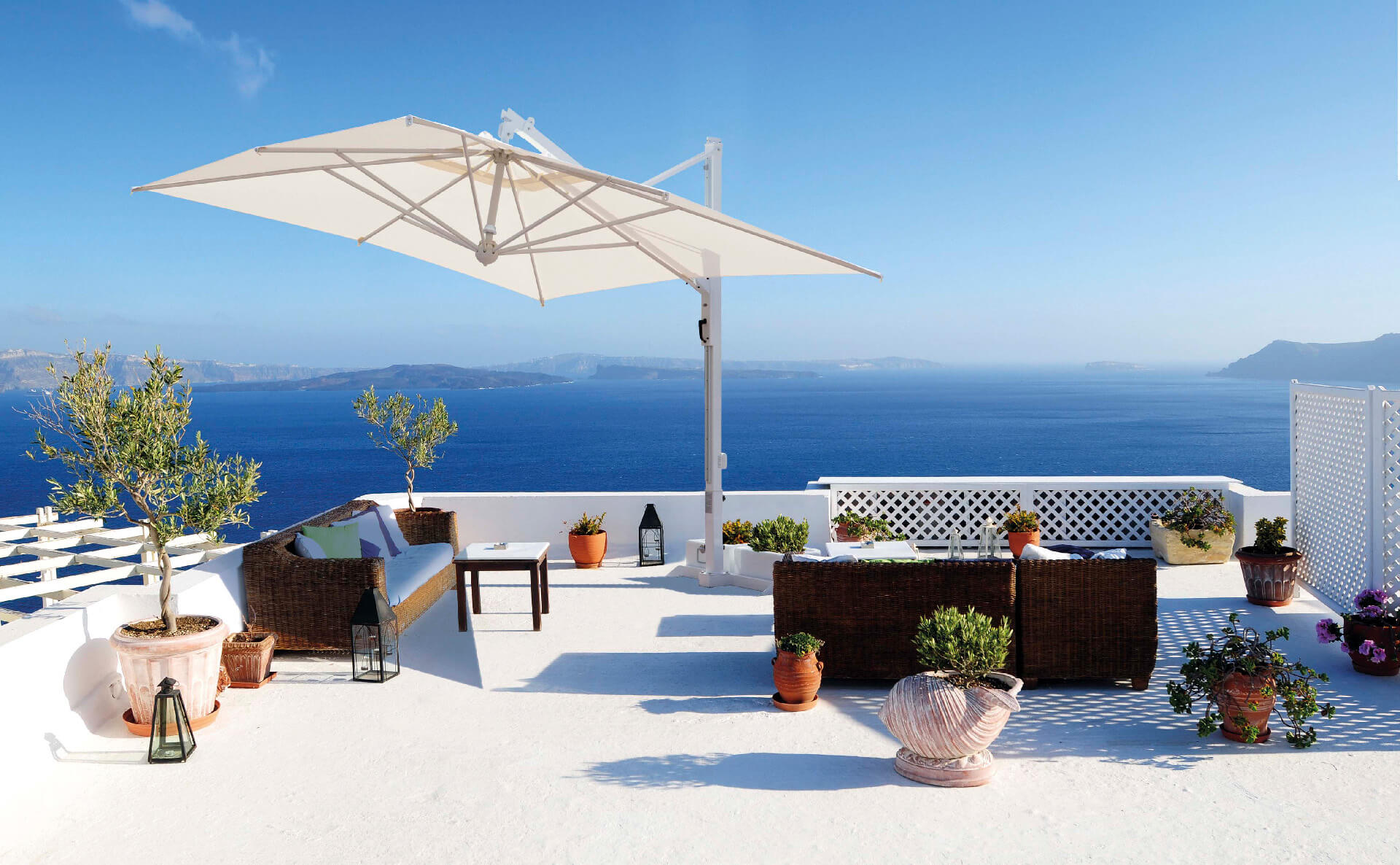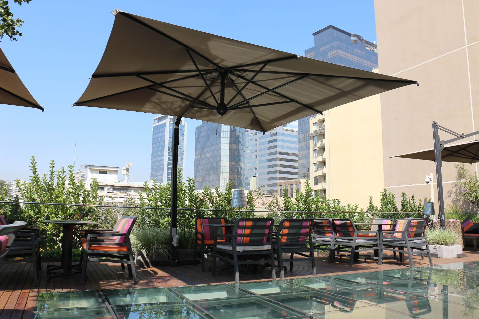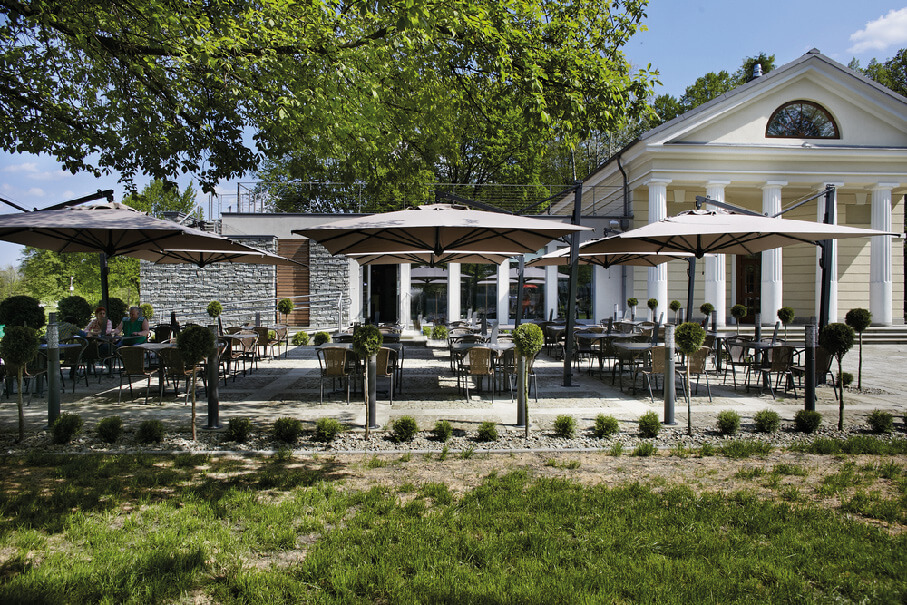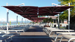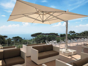Schirm mit einziehbarem Öffnungssystem oberhalb von Tischen und Stühlen. Scolaro hat dieses einzigartige System auf dem Markt entwickelt und hat folgende Punkte besonders berücksichtigt: Funktionalität des Systems, Aesthetik, einfacher Austausch aller einzelnen Teilen.