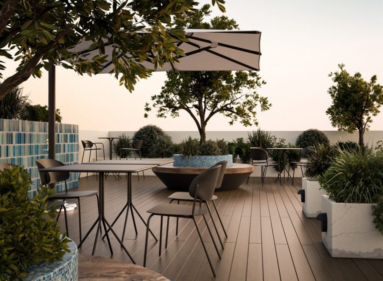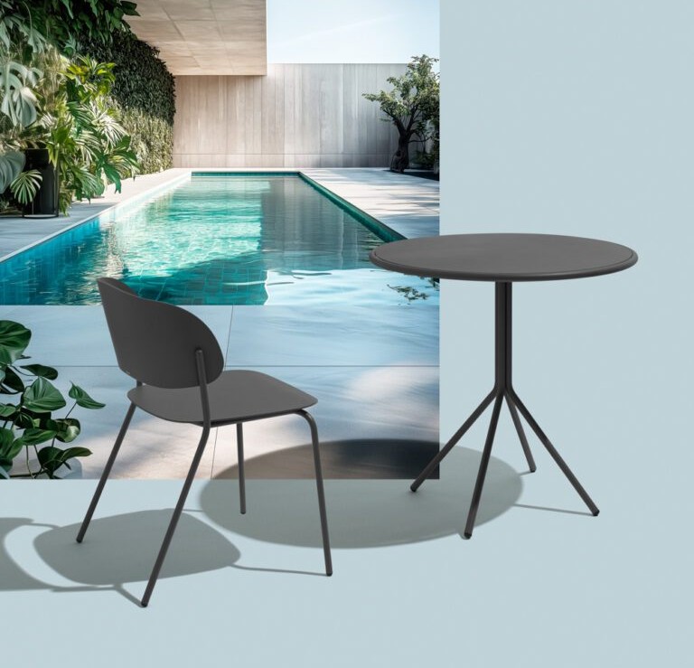 zur Kollektion gerhört auch ein Loungesessel, Barstuhl und Tische
