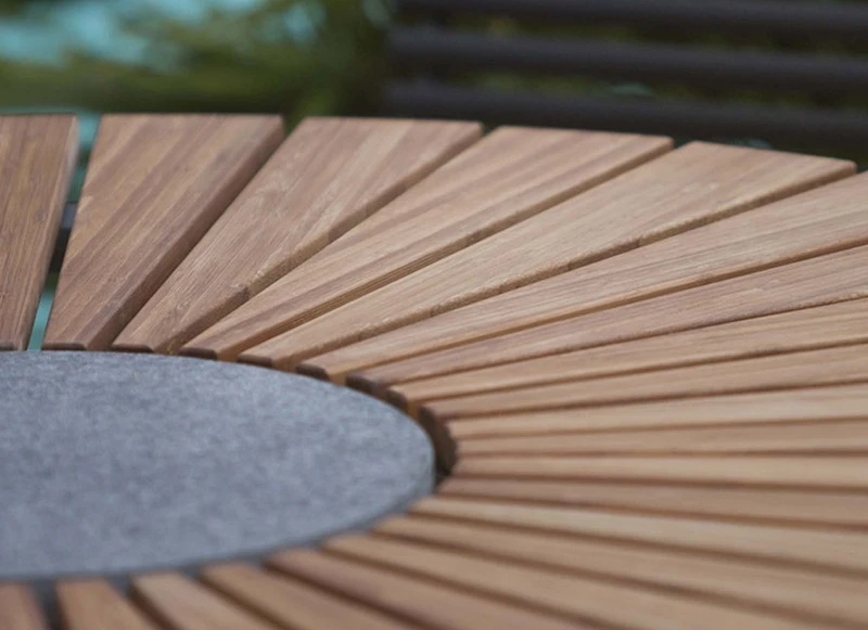 Gestell Metall pulverbeschichtet, grau Tischplatte Bambus-Lamellen geölt, mit Granitplatte in der Mitte zum Abstellen von heiße Töpfen und Pfannen