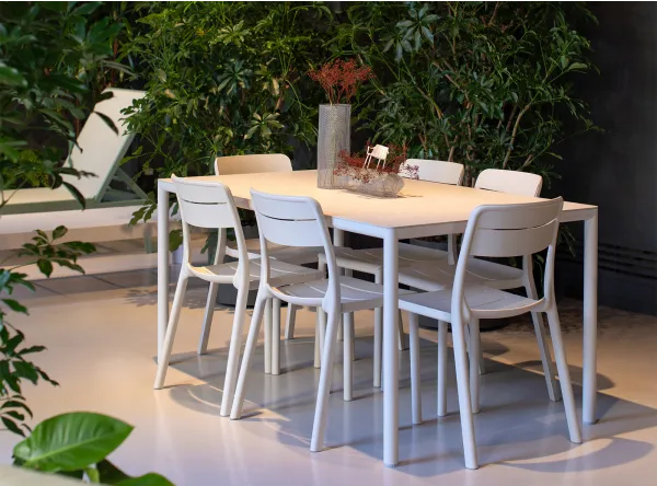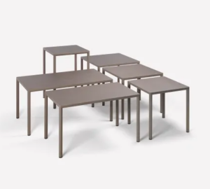 Fläche aus ultradünnem, plastischem Laminat, abgerundete Ecken und robuste Aluminiumstruktur mit rundem Querschnitt.