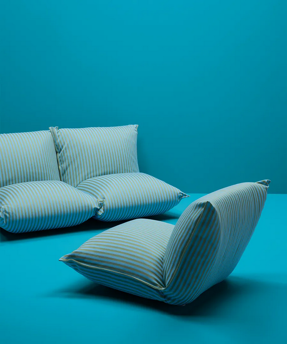 Der Polstersessel Brezza Relax. Für Outdoor-Bereiche entwickelt, ist er von der archetypischen Form zwei großer Kissen inspiriert, die in ihrer Kombination für eine Sitzfläche samt Rückenlehne mit großzügiger und praller Form sorgen.