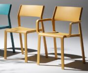 Die Kollektion ist in unterschiedlichen Farben erhältlich und wird von schlichten, zu den originellen Formen der Stühle passenden Tischen begleitet.
